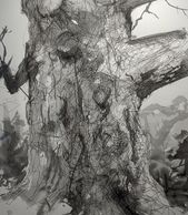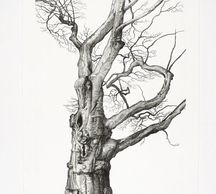 David Barthold knows the importance of a line because he is a contemporary artist making engravings, a method of printmaking that requires every line to be physically cut into a metal plate that will later be inked and printed. This method is lengthy and causes him to further research the stories behind the animals, insects and trees that appear in his work. The trees in David’s work are true city trees. These trees bear the scars from car impacts. Their form is unintentionally designed by the constrainting sidewalks and trimming to accommodate the buildings. He captures the sad strength that is gathered through these experiences; a texture of persistence, abuse and healing.